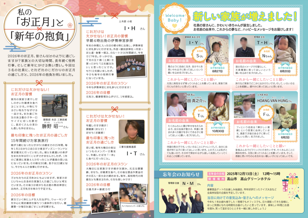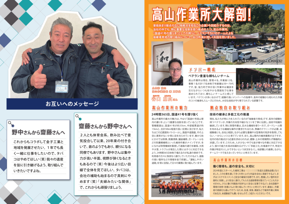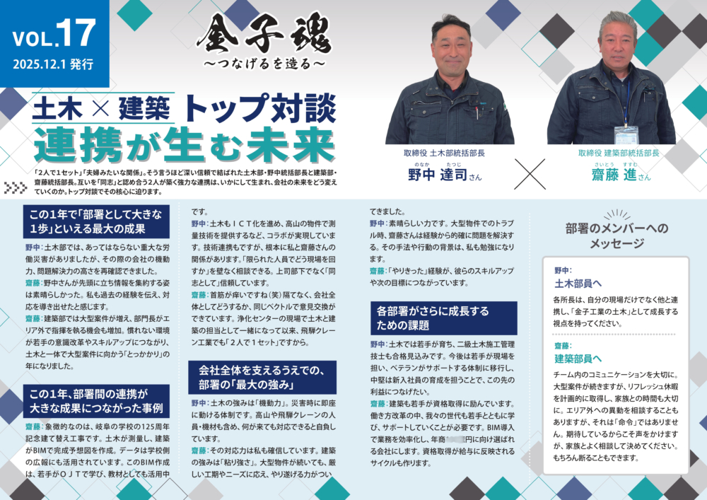 toggle navigation 「つなげるを造る」への想い 会社案内 会社概要 金子工業の歴史 社長メッセージ 安全衛生の取り組み 「つなげるを造る」のために 工事技術の追求と人材育成 インフラの守り手 顧客・施工パートナーと未来を共有 これからの街づくり 業務案内 土木工事 建築工事 不動産事業 活動報告 お知らせ 社員紹介 採用情報 書式ダウンロード お問い合わせ 個人情報について サイトのご利用について HOME> 活動報告一覧> 活動報告詳細 社内報 第17号 12月の社内報『金子魂~つなげるを造る~』が完成しました。 是非ご覧くださいませ📖 【発行目的】 ①拠点・部署を超えた相互理解の促進 ②ご家族に会社や社員の事を知っていただく ③会社の強みを学生・求職者にアピール 第17号内容 ★土木×建築 トップ対談 ★高山作業所紹介 ★私の「お正月」と「新年の抱負」 ★新しい家族が増えました! ★忘年会のお知らせ ※プライバシー保護のため、一部写真の顔写真にぼかしを入れ、名前をイニシャルにして公開しています。 活動報告一覧に戻る>> ページの先頭へ戻る 採用情報 お問い合わせ 活動報告
